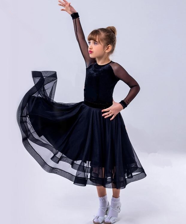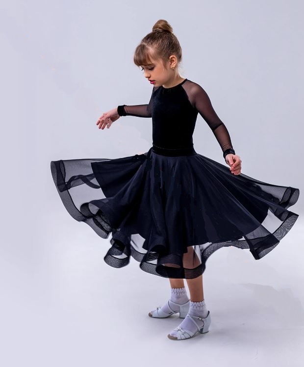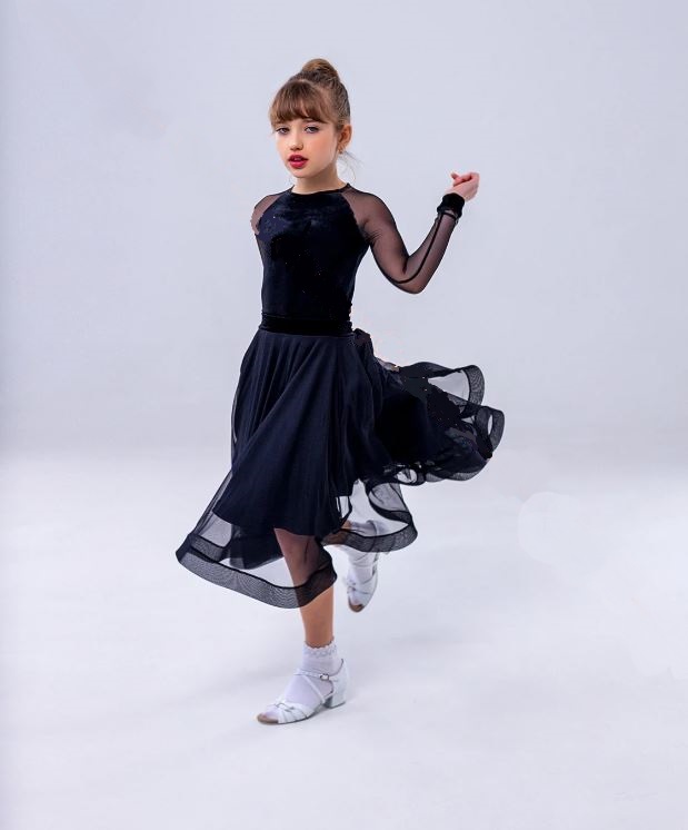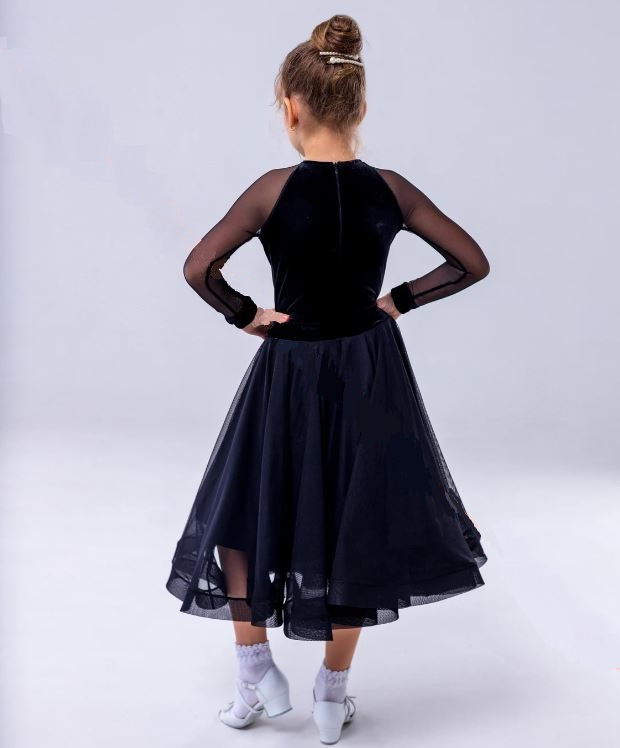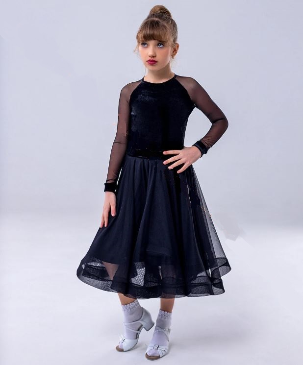 Бейсик выполнен из бархата, в комплекте с двумя юбками- для стандарта и для латины. Купальник из бархата на кнопках, рукава из сетки с манжетами из бархата, с двумя юбками: юбка из бархата годе с отделкой из сетки с регилином и юбка двойная- нижняя из бифлекса на регилине 3 см., верхняя из сетки два солнца на регилине 5 см.