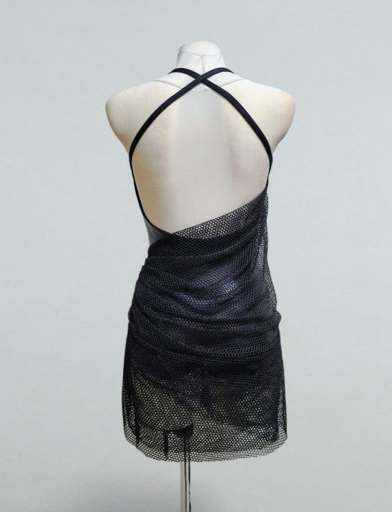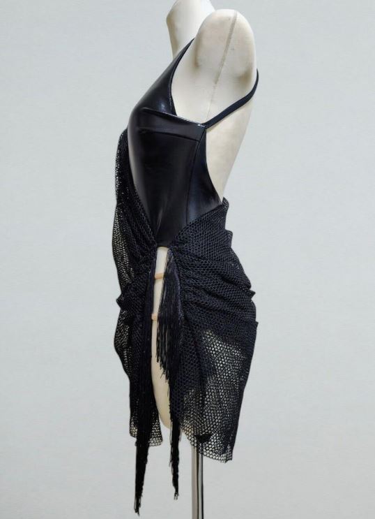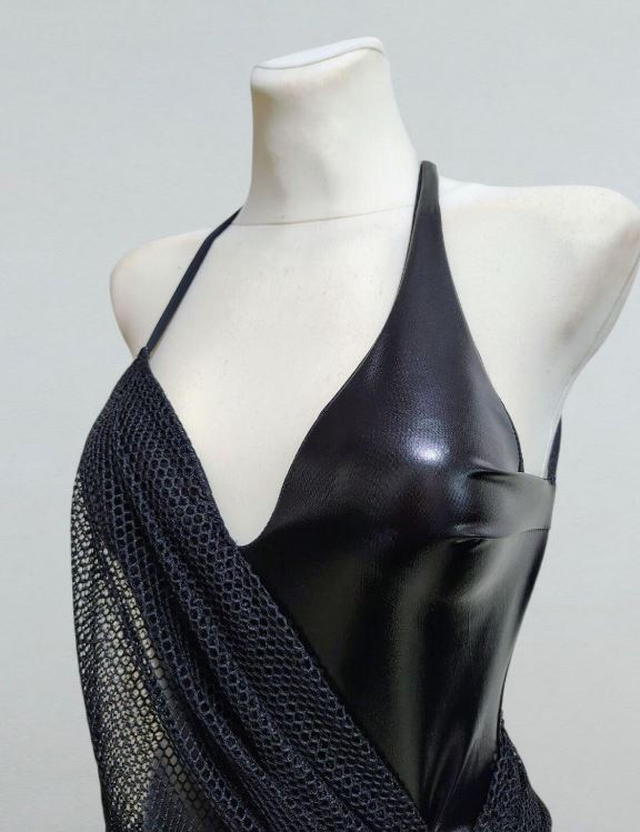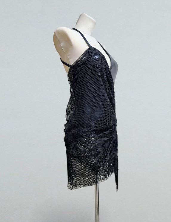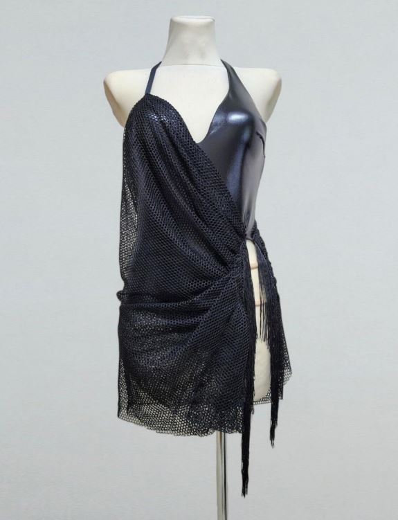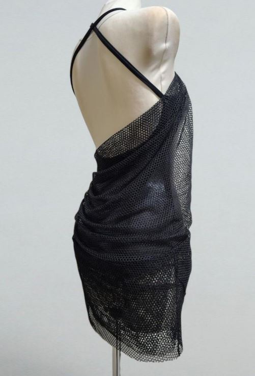 Елегантна чорна латиноамериканська сукня з м'якою сітчастою драпіровкою поверх основи боді з біфлексу wetlook. Асиметрична передня частина збирається на стегнах у тонку китицю, а вузькі бретельки перехрещуються ззаду, щоб силует був впевненим та мінімалістичним. Міні-довжина та бічні рюші створюють чіткі лінії, які легко рухаються для сальси, бачати або ча-ча-ча-ча.
