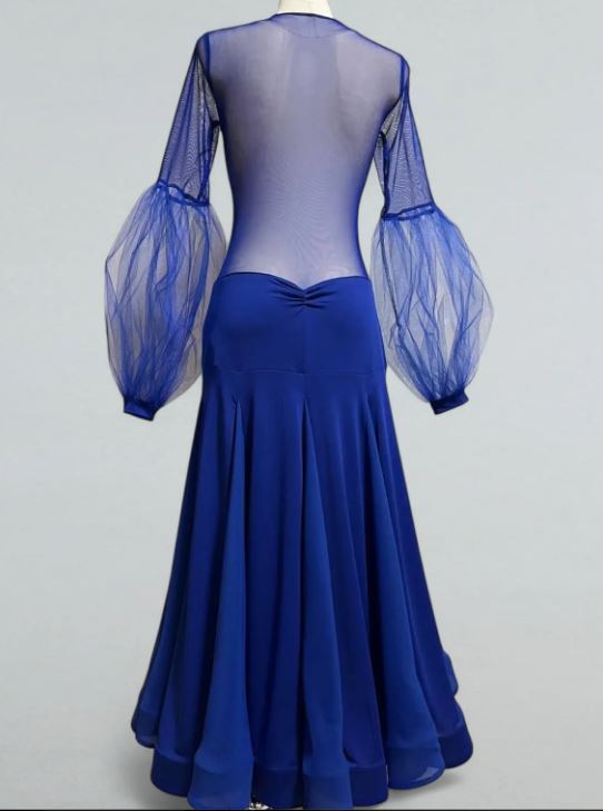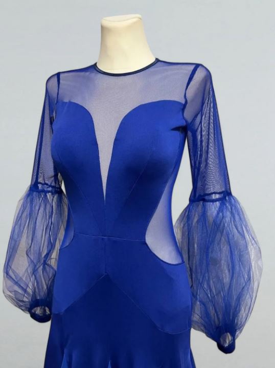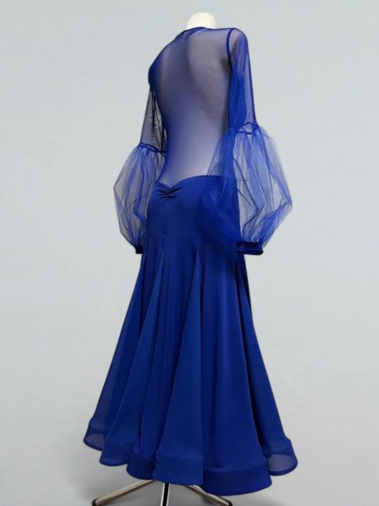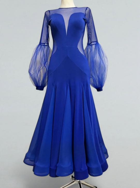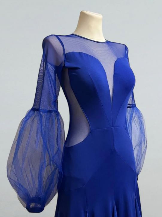 Романтичное платье для стандартной программы бальных танцев с закрытой спиной и круглым вырезом горловины. В основе дизайна платья лежит сложное сочетание двух видов ткани - мягкого трикотажа и прозрачной сетки, придавая платью неповторимый шик, а пышная юбка длиной макси с клиньями и внутренним регилином добавит образу изысканности и неповторимости.